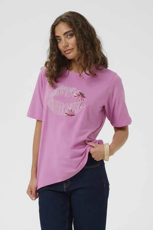 CUkula Gith T-Shirt är den perfekta kombinationen av komfort och karaktär. Den rosa nyansen ger ett mjukt och lekfullt uttryck, medan det dekorativa trycket framtill skapar en personlig och modern känsla. En t-shirt som känns lika självklar till vardags som till mer genomtänkta outfits.