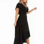 Elegant svart klänning från Capri Collection med volanger, fjärilsärmar och smickrande passform i krinklad viskos. Perfekt för både vardag och fest.