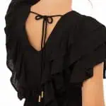 Över bysten och ryggen faller två lager vertikala volanger som ger klänningen ett elegant och trendigt uttryck. Den v-ringade designen både fram och bak ger en smickrande form, och knytbandet i nacken med dekorativa toffsar skapar en subtil och feminin detalj. Midjan är avskuren med resår baktill för en bekväm passform, medan den lätt utställda kjolen avslutas med en bred volang som ger ett vackert rörelsefall.
