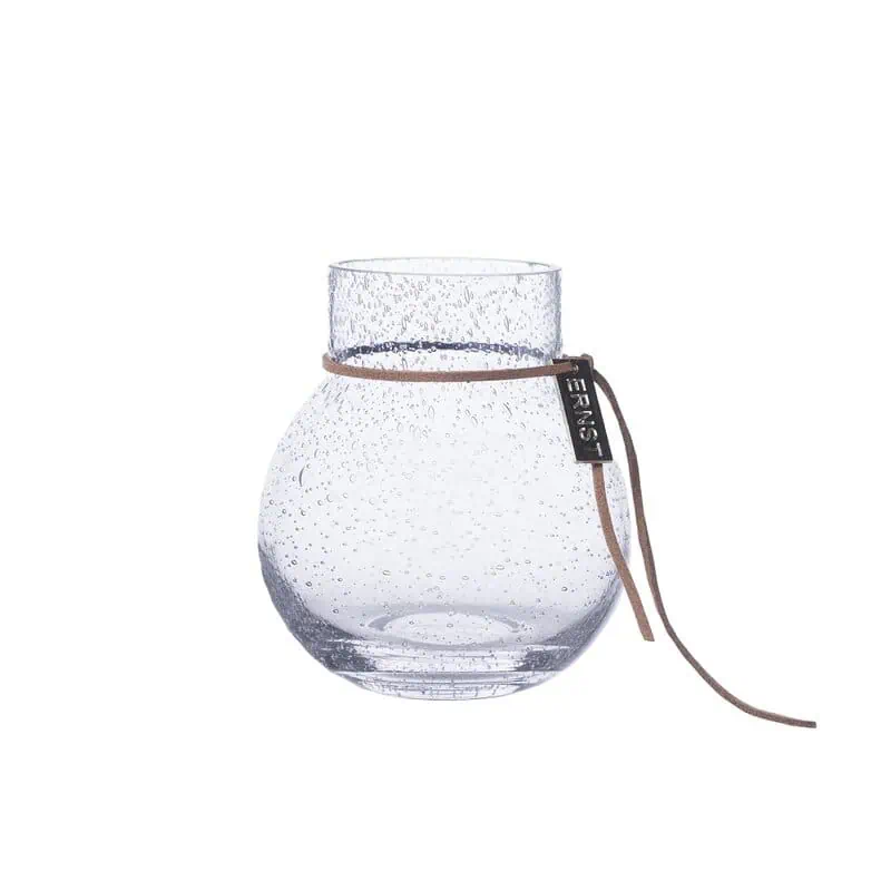 Liten rund glasvas från Ernst med bubbligt munblåst glas, lädersnöre och metallbricka – en stilren detalj med både funktion och känsla.