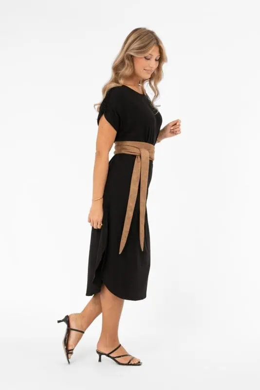 Stilrent svart midjebälte från Capri Collection i mjukt och stretchigt veganläder. Viras två varv runt midjan och knyts framtill för en feminin siluett.