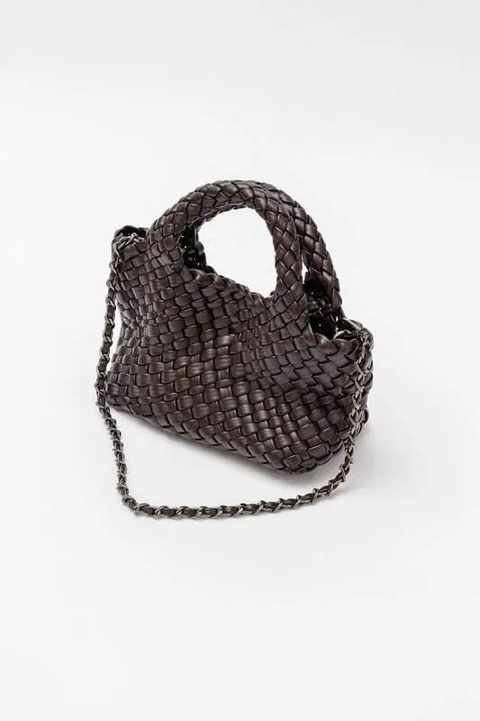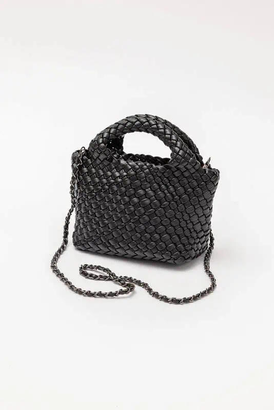 Stilren miniväska i flätad imitationläder med avtagbar kedjerem – perfekt för vardag och fest.