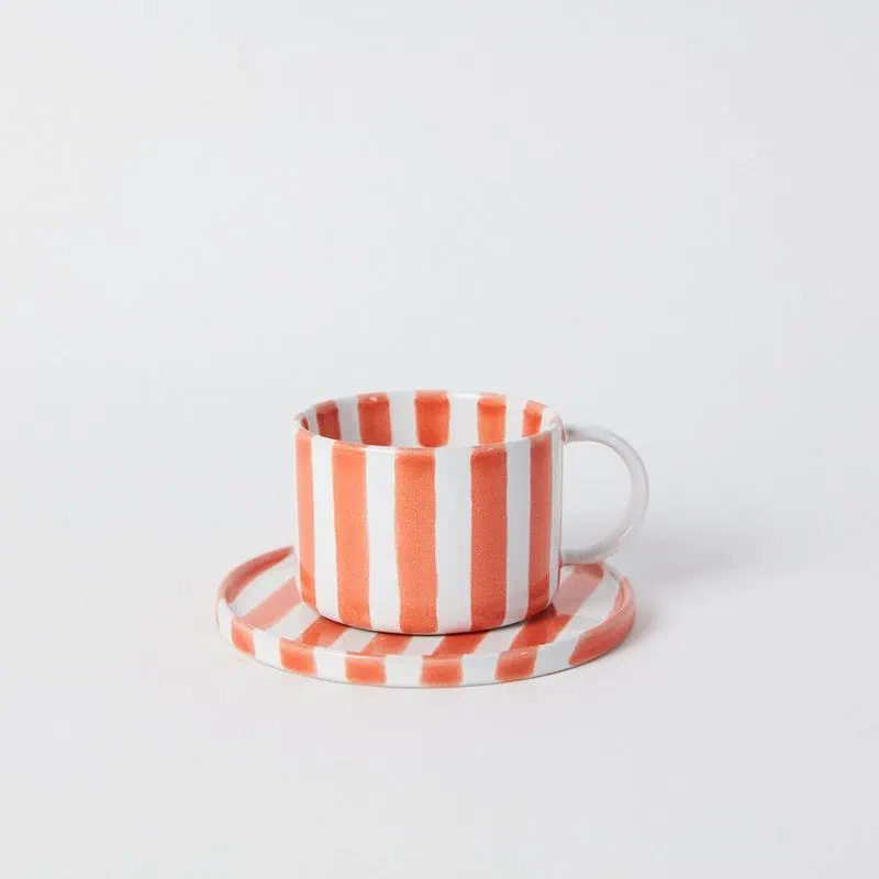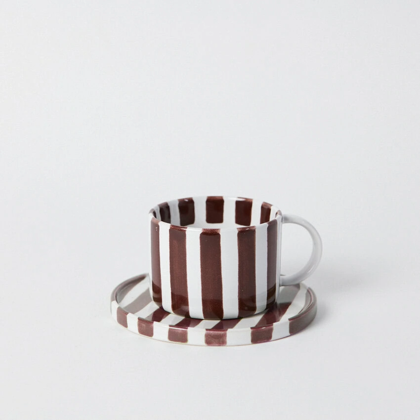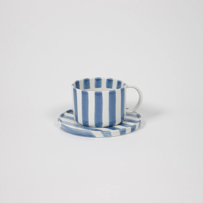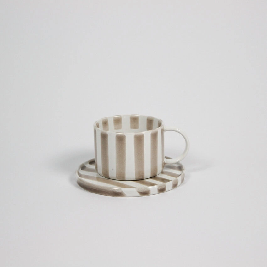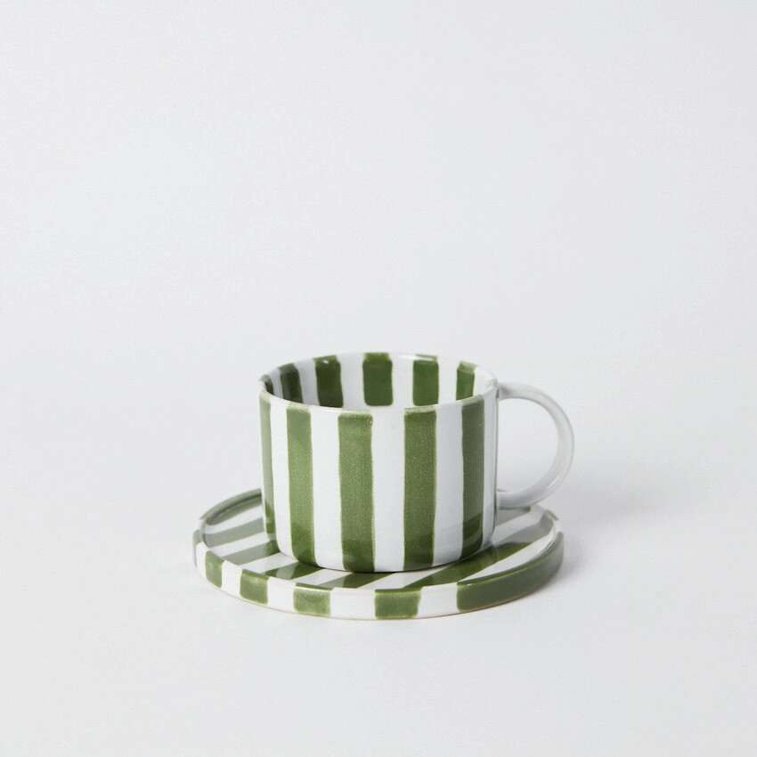 Unik, handmålad kopp med fat från Olsson & Jensen. Grönvita ränder och skandinavisk känsla – varje exemplar är ett litet konstverk.